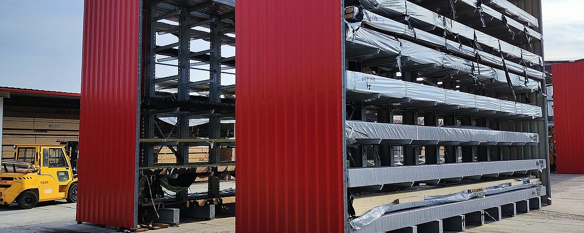 Tvrtka Borovi do sada je skladištila drvo u hrpe ispod nadstrešnica. Međutim, podno skladište zahtijeva puno prostora, a pristup pojedinim predmetima zahtijevao je neprestano premještanje proizvoda, što je oduzimalo dosta vremena. Trgovac drvetom stoga je odlučio stvoriti nove skladišne kapacitete pomoću konzolnih regala. Kako bi se drvo zaštitilo od vremenskih utjecaja, regali su s obje strane zaštićeni krovom dubokim 2,7 m. Na čelne strane regala montirani su okviri za izlaganje, koji kao bočnu stijenku imaju praškasto bojeni trapezni lim. Osim toga, stalci regala izvedeni su U-profilima u koje se mogu umetnuti daske. Tako izvedene stijenke od lima dodatno štite drvo od padalina. Ovakav način gradnje uštedio je Borovima dugotrajnu i skupu izgradnju novog skladišta.