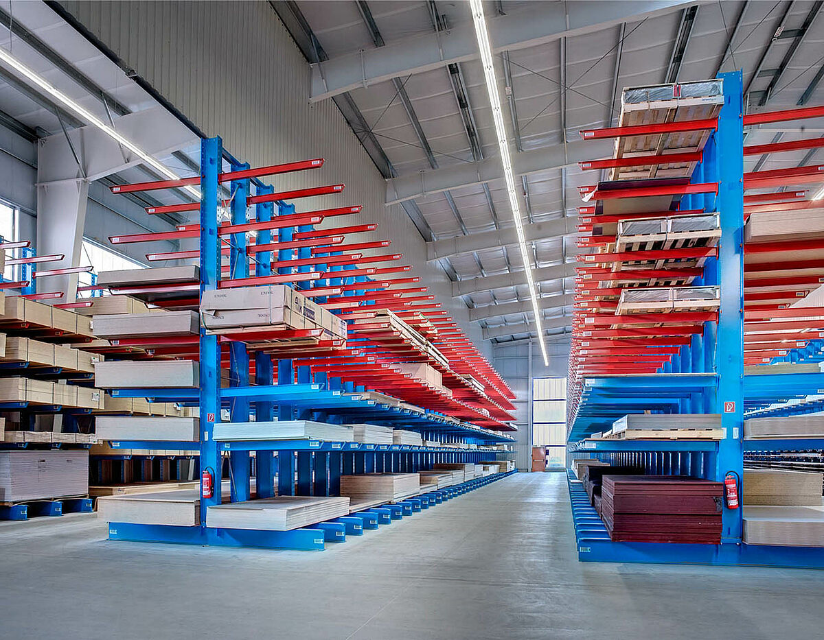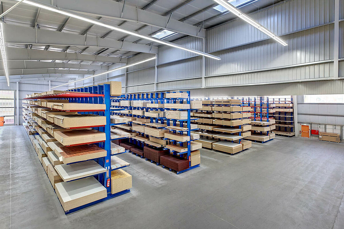U „hali za drvene ploče“ su dužine konzolnih poluga s izbočenjem od do 2.100 mm optimalne za skladištenje ploča od drveta i iverice. Visina skladišta iznosi ovdje 6.500 mm, pri čemu usljeđuje upravljanje pomoću četverostranog viličara s priključnom platformom za komisioniranje.