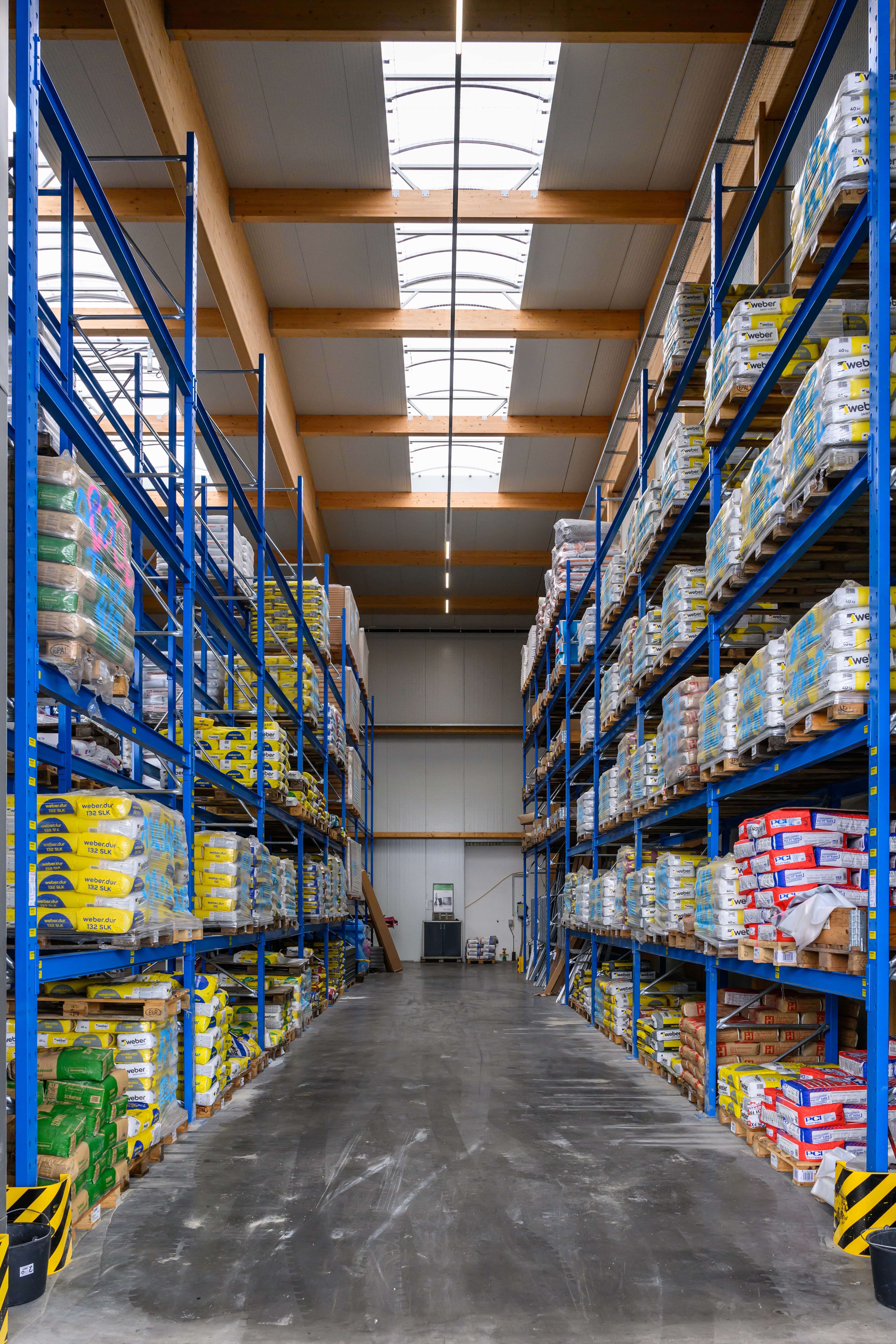 Zbog različitih materijala OHRA je skladišne prostore opremila i konzolnim i paletnim regalima. Postavljena su ukupno 22 regala, jednostruke i dvostruke dubine i visine do 7.500 milimetara. Svaki regal konfiguriran je pojedinačno za različitu robu u smislu nosivosti, broja razina skladištenja i pribora. Dok su unutarnji regali lakirani u boju po želji, vanjski regali su pocinčani i na taj način zaštićeni od vremenskih utjecaja. Neki regali su opremljeni dodatnim nosačima ili rešetkama kako bi bili što fleksibilniji pri skladištenju artikala različitih dimenzija. Također, posebnost je krajnji regal u hali: Izrađen je tako da može primiti zaštitnu ogradu između osovina – stoga služi kao stražnji zid zgrade.