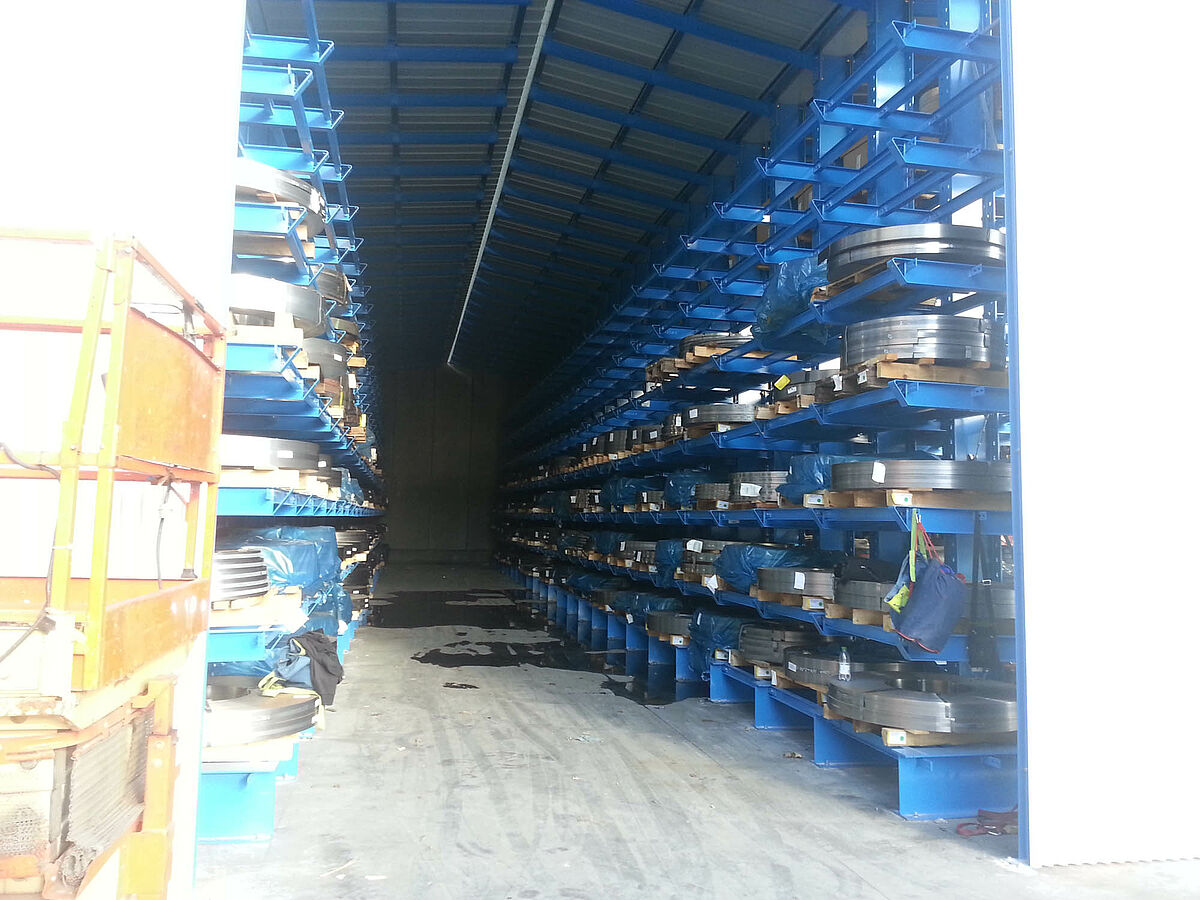 U prva 3 reda regala skladišti se 6.500 milimetara dugog i 4.000 kilograma teškog grupiranog materijala za metalne šipke, i to dvostruko na devet etaža. Konzole regala su pričvršćene i mogu se podesiti putem vijaka točno u milimetar - time se osigurava ravnomjerno postavljanje skladišne robe. Ovi prolazi namijenjeni su za viličar s mogućnošću kretanja u četiri smjera koji se koristi tračnicama postavljenim na stupovima. Ostatak regalnih odjeljaka opremljen je konzolama te tako stvara prolaznu površinu unutar skladišta, i to na sedam etaža. Ovdje se može skladištiti do 1.200 kilograma teških limenih traka koje su postavljene na palete. Ovi su prolazi namijenjeni za jedan viličar.
